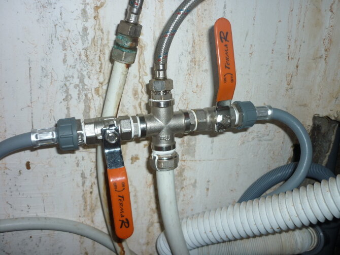 Дополнительная труба водопроводной системы протягивается к месту установки стиральной машины, где производится ее подключение описанным выше способом.