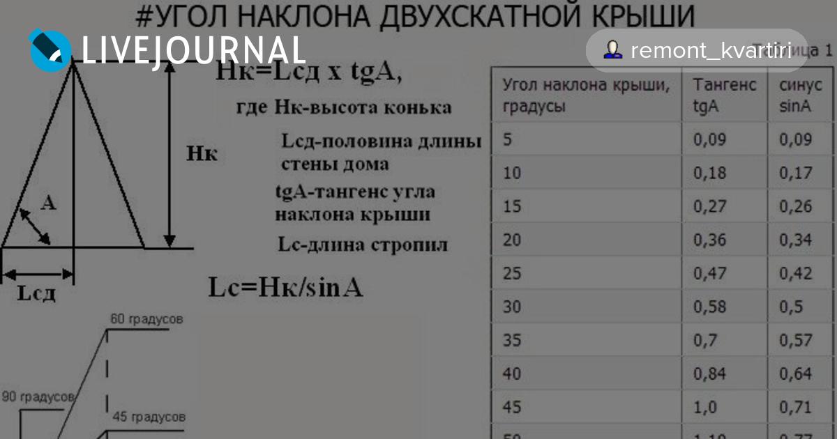 Можно запомнить такое соотношение. 100 % — это угол 45 градусов, когда катеты прямоугольного треугольника равны между собой, то есть в нашем случае высота ската равна длине его горизонтальной проекции.