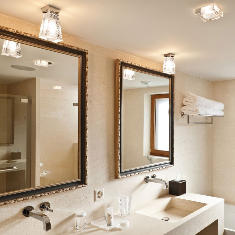 Хотя встроенные потолочные светильники лучше всего подходят для такого рода зеркал, вы также можете взглянуть на тонкие сгруппированные подвески, которые действительно могут добавить к вашему общая эстетика ванны.