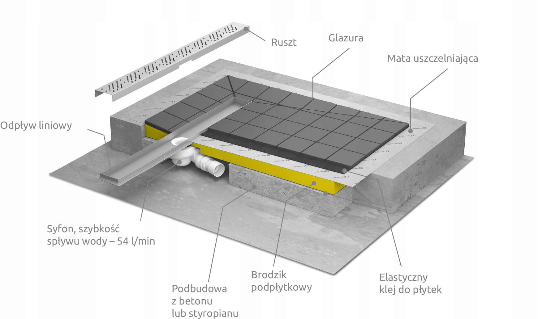 Направляющие и фланец монтируются на одном уровне. Это предотвращает растрескивание шва. Поскольку сделать это достаточно сложно, может понадобиться перфоратор. Во всех трапах для душа лотковой формы внутри по всей длине трапа для душа выполнен уклон к центру к сифону, что делает отвод воды более эффективным и быстрым. Если вы хотите повысить комфорт при пользовании душем и установить систему теплого пола, проведите необходимый монтаж.