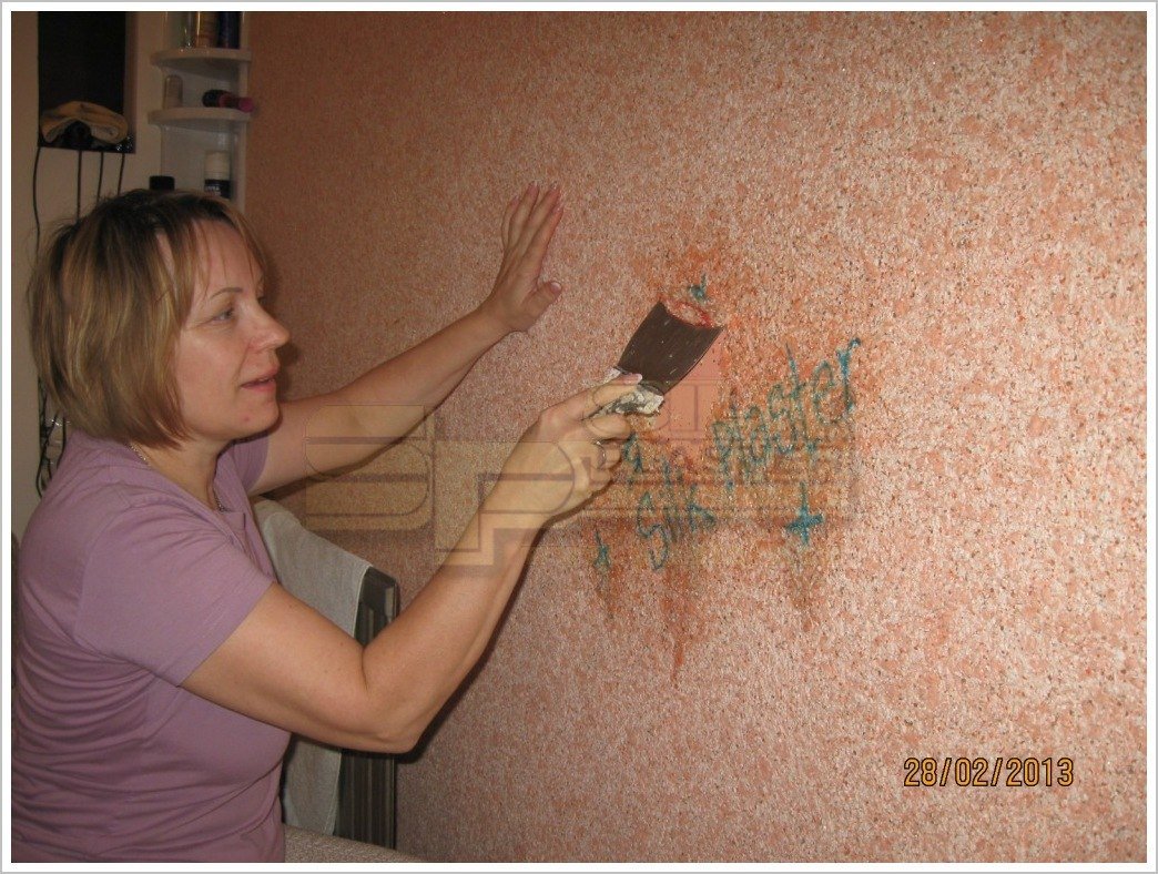 Придать способность этому виду декоративной штукатурки отталкивать воду можно только одним способом – покрыть слоем обыкновенной грунтовки глубокого проникновения или лаком. В последнем случае могут возникнуть некоторые трудности с ремонтом поврежденных в процессе эксплуатации участков. Размочить и снять обои в местах повреждения будет весьма затруднительно. Как правило, для того чтобы жидкие обои хоть как-то можно было очистить от пыли и грязи, вполне хватает обычной грунтовки.