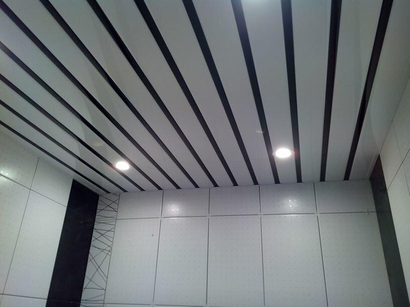 Одним из самых подходящих вариантов отделки потолка в помещениях с повышенной влажностью это реечный подвесной потолок. В него легко можно встроить точечные приборы освещения. Под ним удобно разместить различные коммуникации – трубопроводы, вентиляцию и провода освещения. Реечный потолок для ванной — это идеальное решение для помещений с повышенной влажностью.