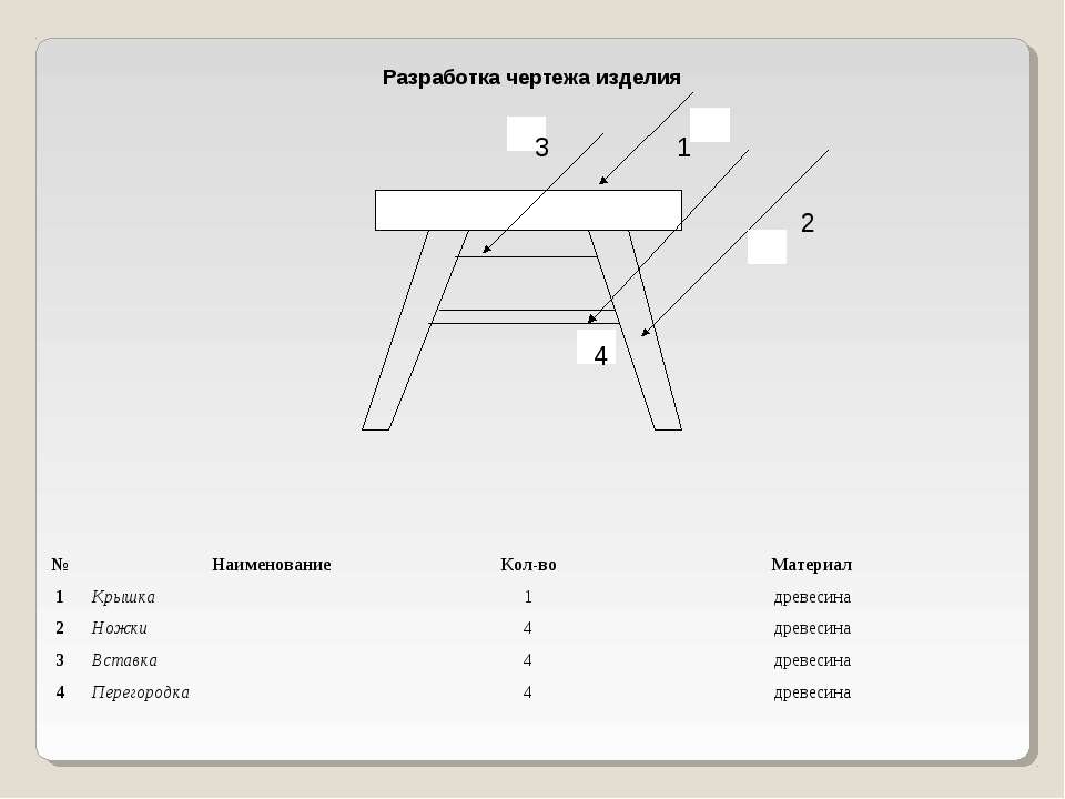 Материалы и оборудование: образец табуретки, измерительные линейки, таблица «Техника безопасности», чертеж табуретки, технологическая карта изготовления табуретки, заготовки для изготовления деталей табуретки.