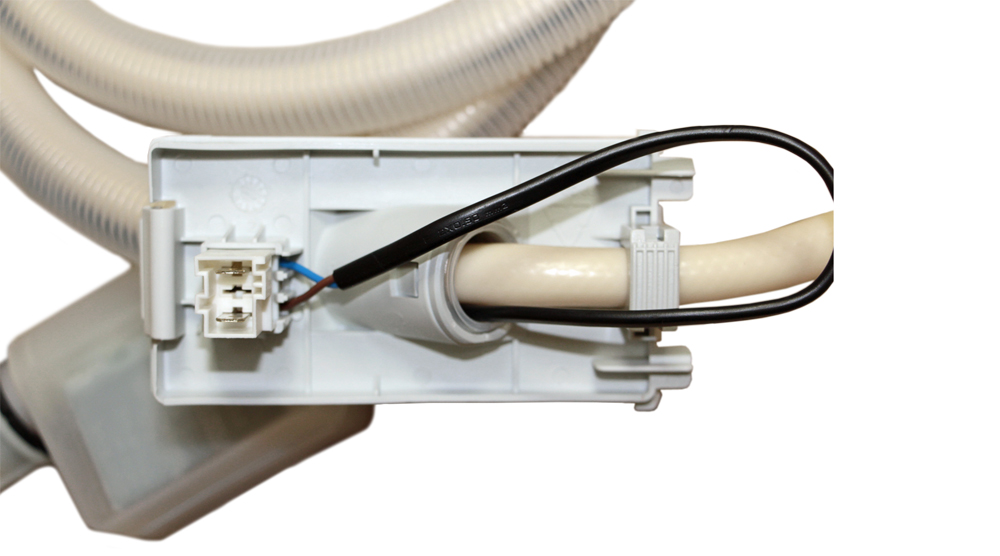 Но, в случае с впускным клапаном, то он идет в сборе со шлангом забора воды. Можно сказать шланг в шланге. Система тут такова, клапан крепиться на кран, а от клапана идет грубый шланг, назовем его кожух, внутри которого есть еще один шланг, но тоньше и провод безопасности с контактами. Это необходимо для обеспечения безопасности и дабы уберечь вашу посудомоечную машину от протечки воды. Ведь, если этот тонкий шланг забора воды, лопнет где-то после впускного клапана, то вода из толстого кожуха никуда не денется, а потечет в посудомоечную машину. А там уже при наборе воды подымиться поплавок, и перекрое впускной клапан. Причем перекроет клапан возле самого крана подачи воды. На самом деле вот такая схема и является защитой от протечек в посудомоечной машине.