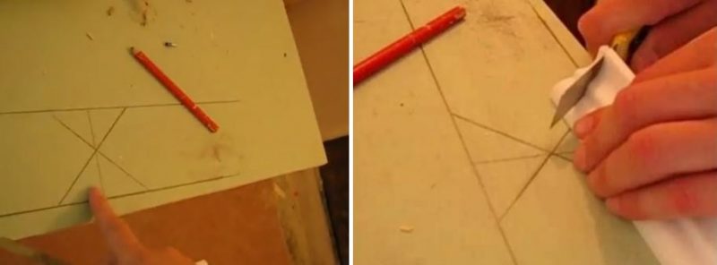 Для этого необходимо взять две доски и сколотить из них уголок. Затем взять бумагу и начертить на ней линии, идущие под различными углами. Теперь рассмотрим, как вырезать углы с помощью получившегося инструмента: