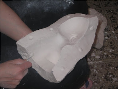 После загустевания проверяют, насколько хорошо модель отделяется от нижней половинки, смазывают ее и модель и заливают верхнюю половину формы. После загустевания верхней половинки по углам сверлят отверстия для штифтов, которые будут фиксировать половинки при отливке.