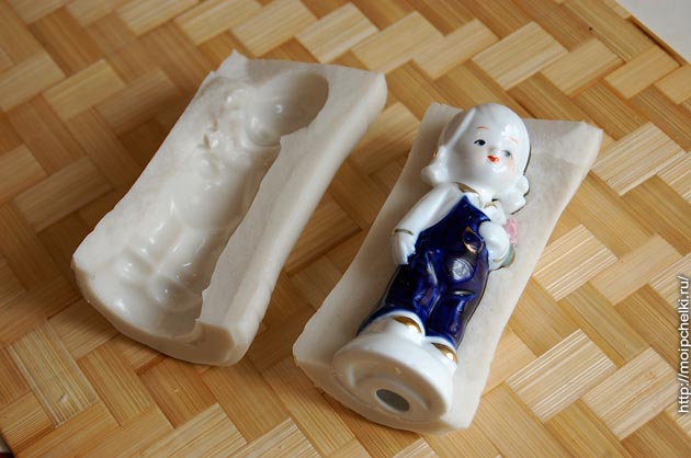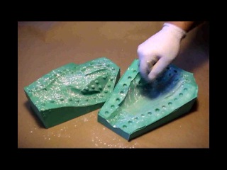 В пластилине должны быть небольшие дырки, чтобы части формы не сместились в момент отливки. Далее отмеряется необходимое количество силикона. Поверхность модели смазывается смазкой из воска. После заливки верхняя часть формы должна затвердеть.