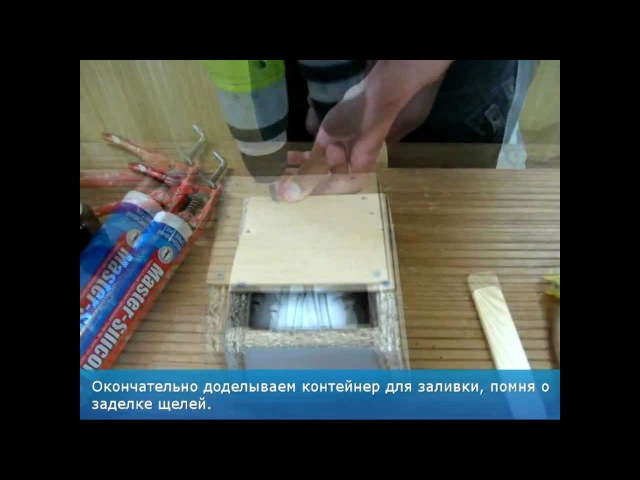 Сначала создаётся контейнер для заливки силикона. Контейнер может быть сделан из ДСП, дерева или любого другого материала. Можно использовать уже готовый контейнер. После формы тщательно склеиваются так, чтобы не оставалось никаких щелей и проёмов. После этого следует воспользоваться скульптурным пластилином.