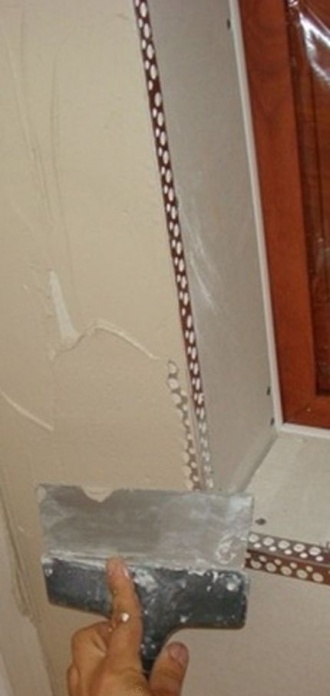 - Установка уголка. Это наиболее ответственная операция, от правильности которой зависит качество всей отделки. Сложность процедуры в том, что контрашульц необходимо выставить и по вертикали, и по высоте выравнивающего слоя. Удобнее всего посадить его на алебастр, проверив вертикальность установки по отвесу. Что касается высоты фиксации, то она определяется визуально: желательно, чтобы толщина накладываемого слоя не превышала 10 мм.