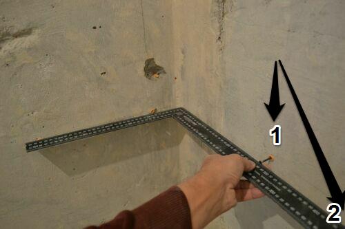 Первая планка монтируется с отступом от угла на 10 см: для ее фиксации можно использовать густую штукатурку или алебастр. Выставив этот маяк на нужной высоте, аналогично монтируют еще одну направляющую с противоположной стороны стены.