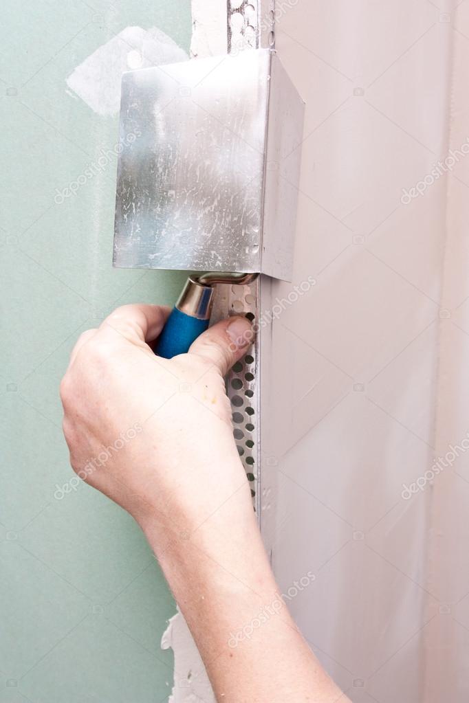 Гипсокартонными плитами можно оформлять как внутренние, так и наружные углы. Как и в случае со штукатуркой по маякам, обычно такой метод применяется для сплошного выравнивания всех стен. Также встречаются ситуации, когда гипсокартоном зашивается одна из стен (например, возле окна). В любом случае, полученные таким образом углы необходимо окончательно оформить штукатуркой или шпаклевкой. Так как общая плоскость уже задана листами, то понадобится лишь сгладить переходы с одной стороны на другую. Швы предварительно заделывают специальной смесью Фугенфюллер и армируют сеткой серпянкой. В случае с наружным углом рекомендуется применить знакомый перфоуголок.