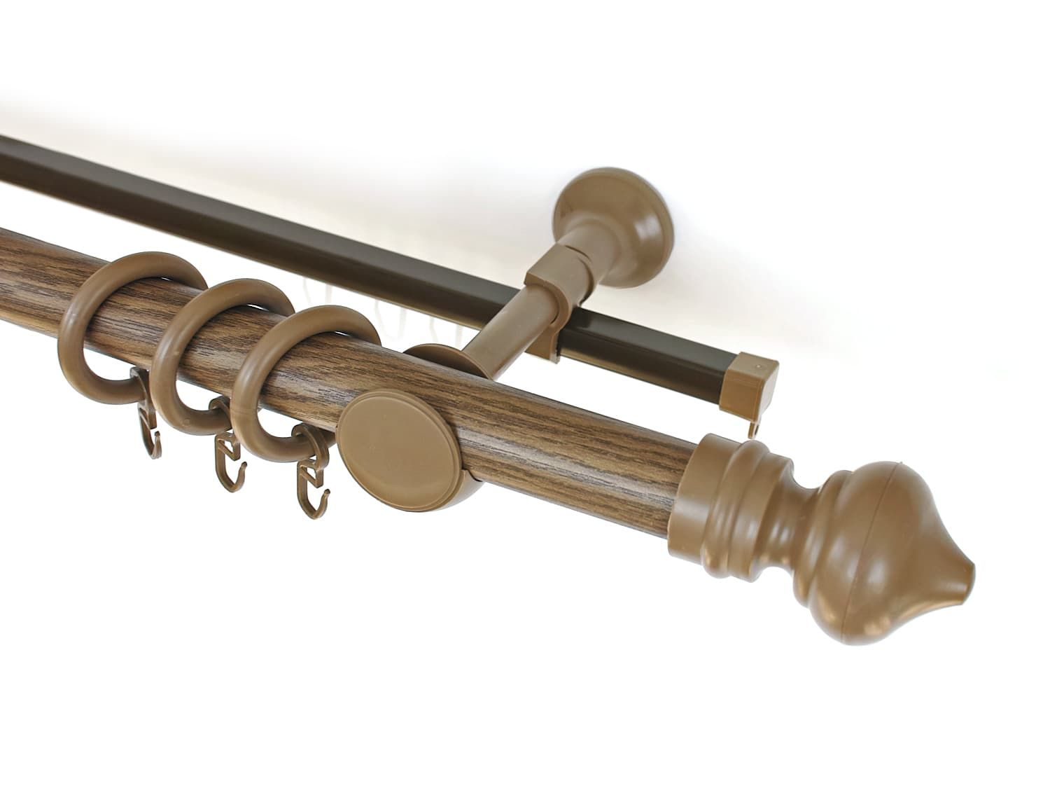 Деревянные карнизы – это в основном классические круглые модели. Древесина красива эстетически, прочна и долговечна. Особенно популярны дубовые карнизы.