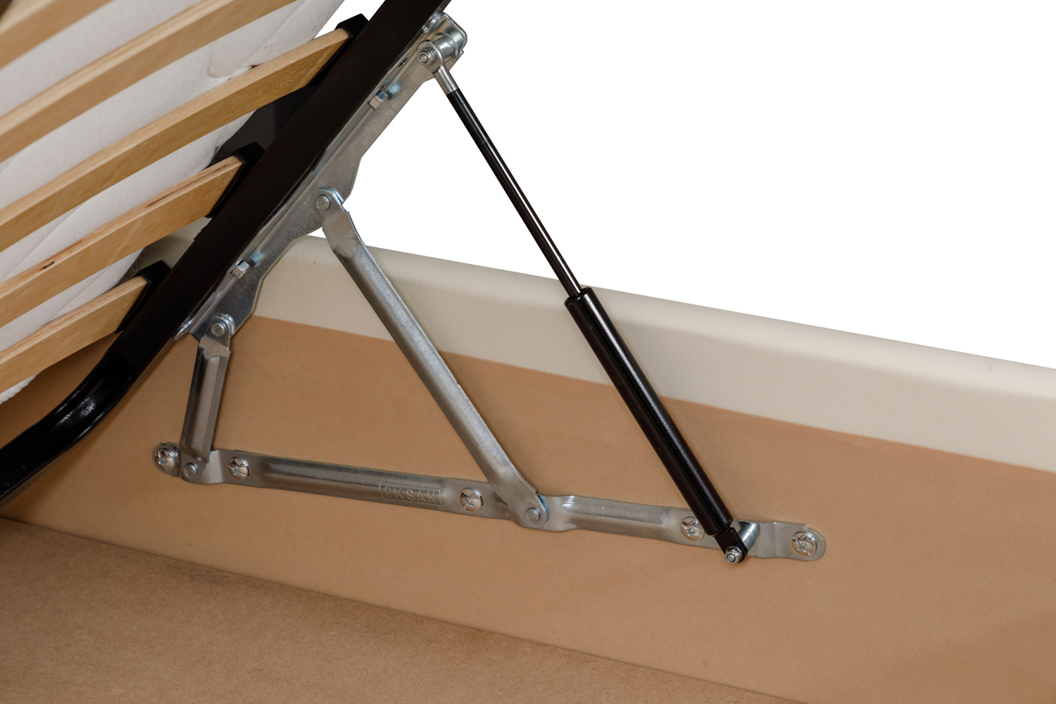 Пластины и уголки прикрепляются к спальному месту и к боковинам короба. При опускании происходит поворот пластин на оси и газовый лифт сжимается под давлением, создаваемым весом спального места. При подъеме сила давления газа выталкивает поршень со штоком, который плавно переводит ложе в вертикальное положение.