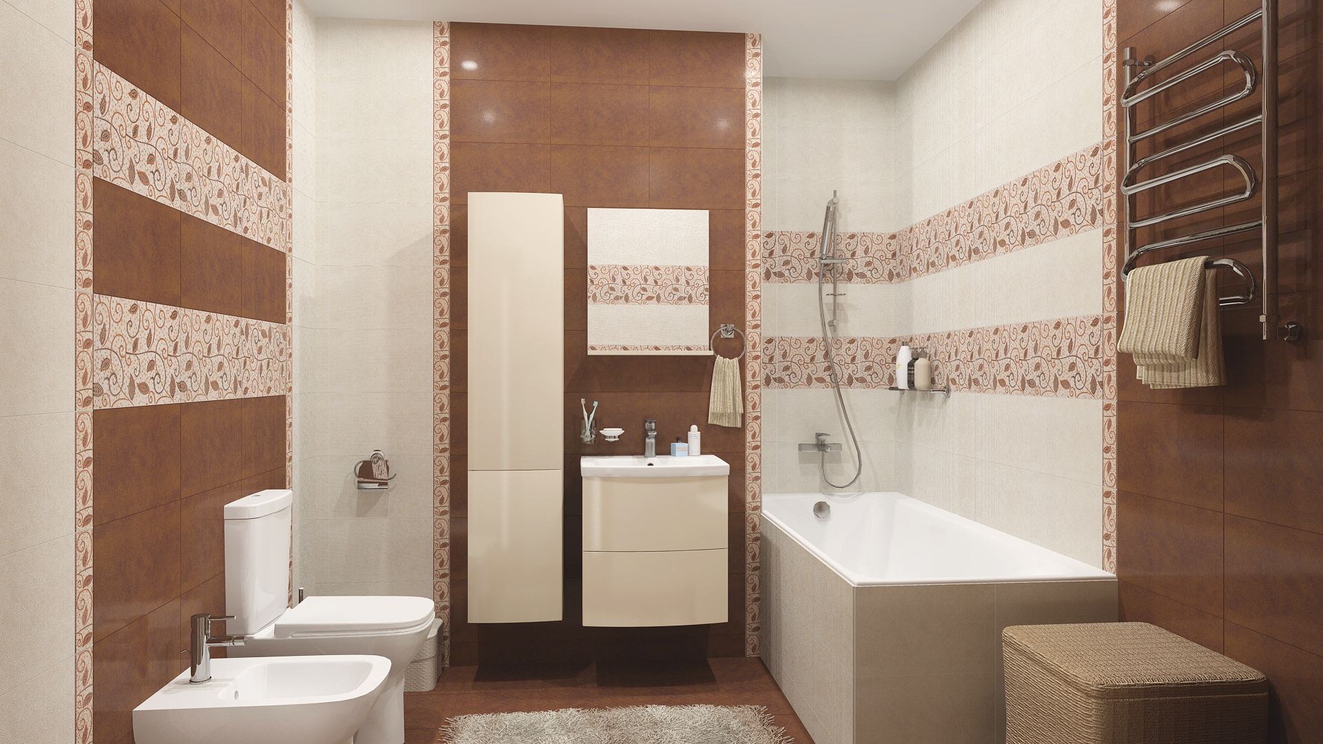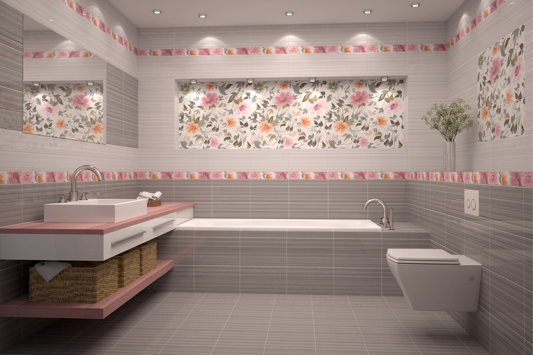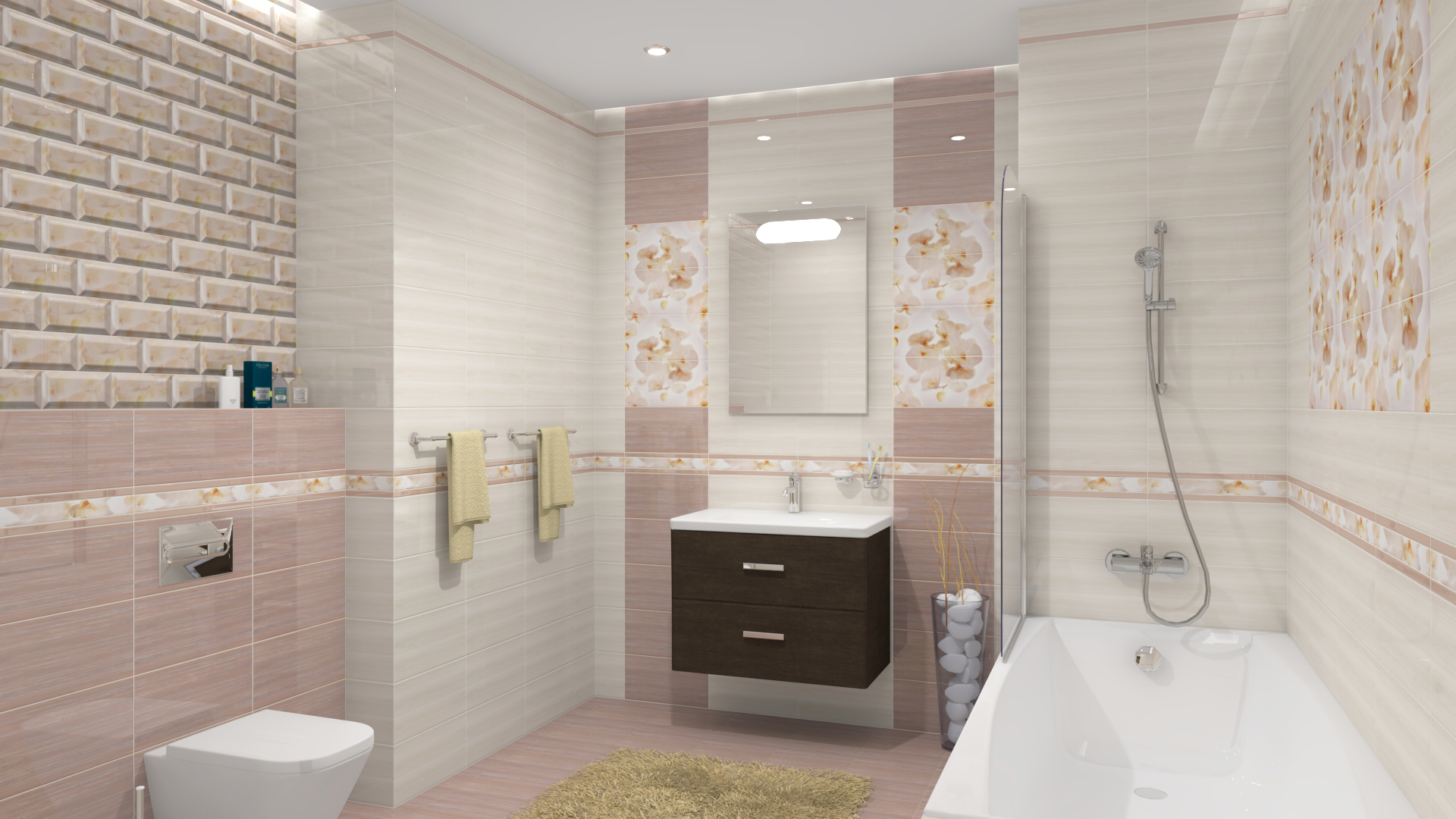 На стене целесообразно перейти к светлому цвету с последующими отделением полоской или декорами в еще более светлых тонах. Контрастные плитки в просторном помещении помогут расставить акценты.