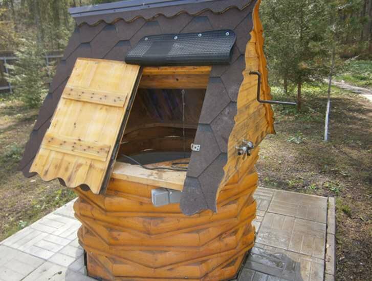 - Закрытый домик с низкой кровлей, установленной прямо на основание. Непосредственно в крыше размещается дверца, через которую можно набирать воду.
