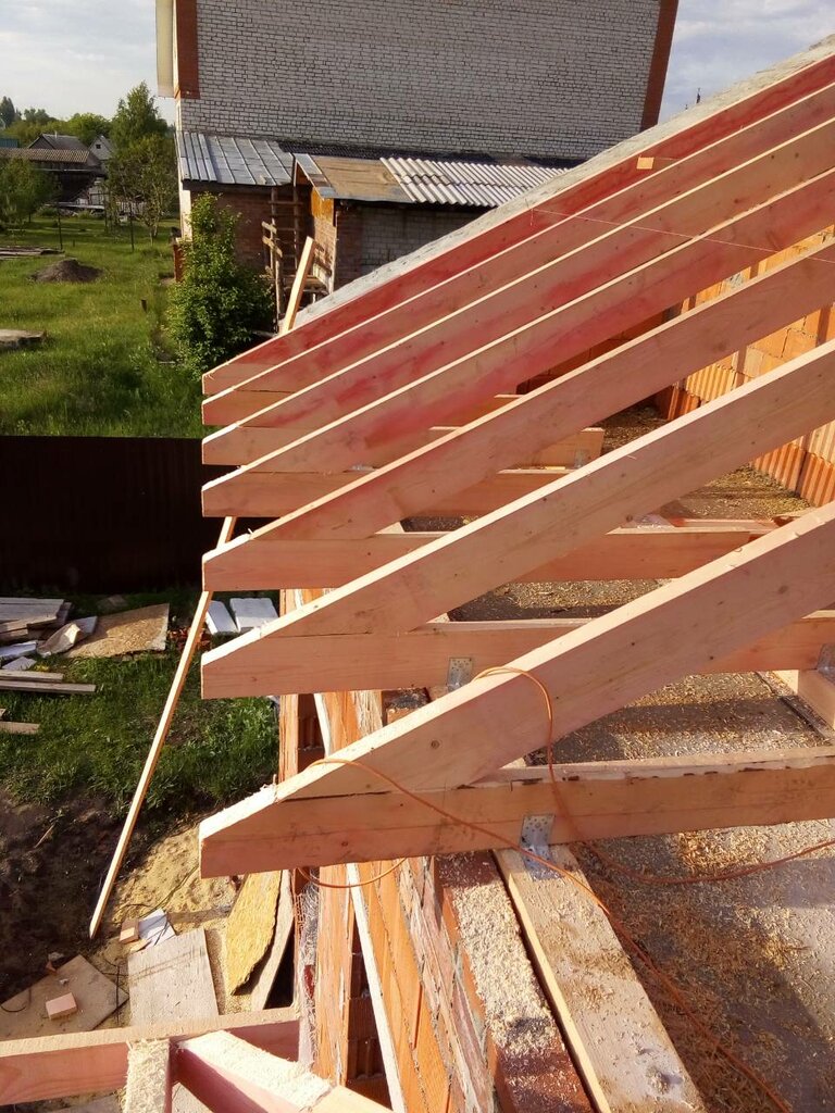 В зависимости от конструкции крыши для крепления могут использоваться гвозди, металлические накладки, уголки или шпильки. Конструкция таких стропил обычно включает поперечную стяжку – ригель, и все необходимые зарезы и подпилы. С земли готовые стропильные конструкции подают по наклонным доскам при помощи веревок или лебедки. Местоположение стропильных ног размечается заранее на мауэрлате и коньке с учетом выбранного шага.