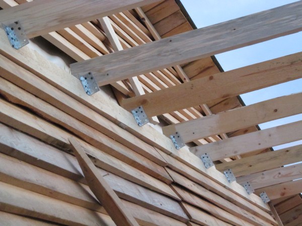 Таким образом, каждая стропильная нога одним краем опирается на мауэрлат (для этого в ней делают запил), а другим – в паз стены дома. Шаг между этими балками составляет 0,6-1 м. Если необходимо, на этом этапе делают подкосы.