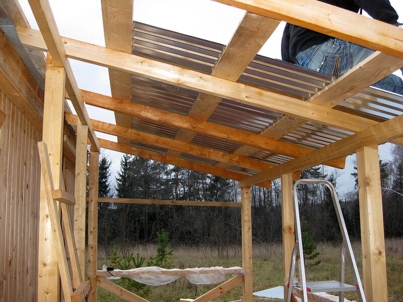 Односкатный вариант выполнить совсем несложно. Начиная строительство, стоит заручиться помощью друга или родственника для подстраховки. Для начала нужно будет собрать стропильную систему. После этого можно начинать монтаж кровли. Проще всего собрать конструкцию на земле и потом провести крепление к каркасу.
