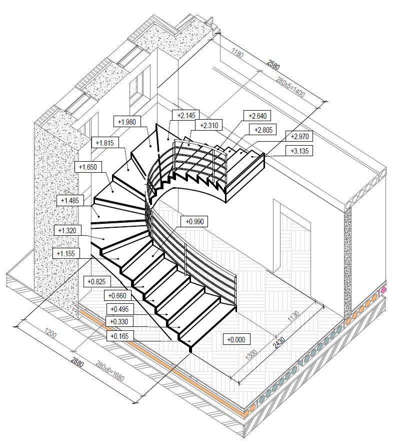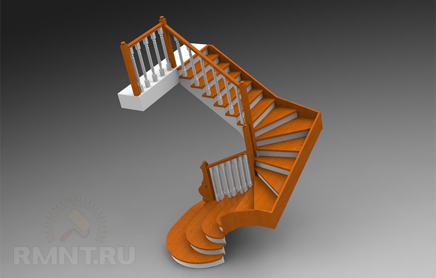 Проступи ступеней криволинейного марша имеют клиновидную форму, причем узкая сторона проступи должна быть не менее 140 мм. Это необходимо для того, чтобы ширина такой ступени по средней линии марша была равна ширине ступеней прямого марша