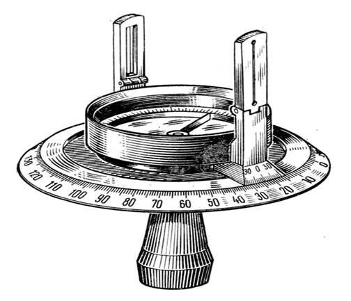 В линейке делались вырезы, в которых натягивались нити, служащие отсчетными индексами. Центр угломерного круга помещался в вершину измеряемого угла, где и закреплялся.