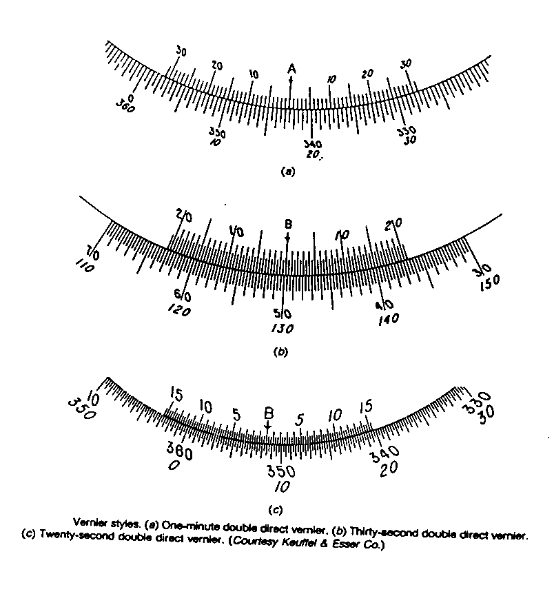 Алидада горизонтального круга представляет собой круг или два диаметрально противоположных сектора, центры которых должны совпадать с центром лимба. Один из диаметров алидады принимается за начальный и обозначается «». От нуля по ходу часовой стрелки нанесена специальная шкала – верньер, разделяющая один градус на определенное количество делений, определяемое точностью прибора.