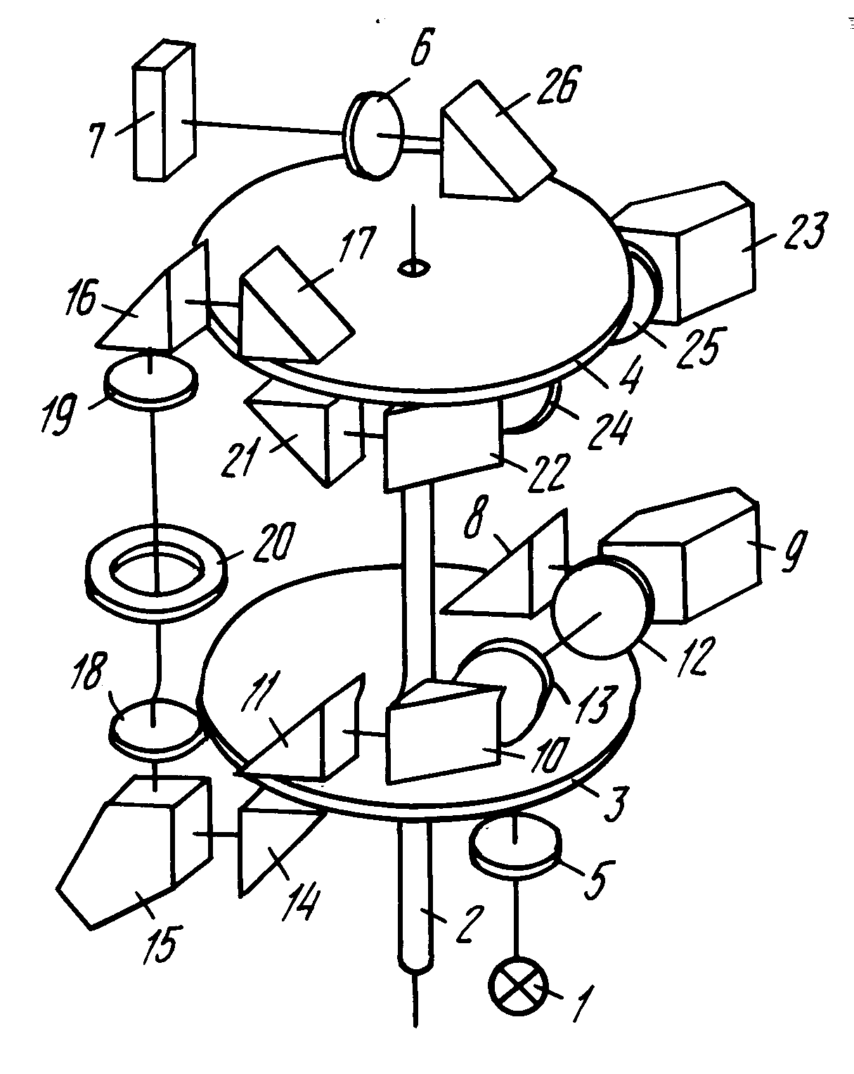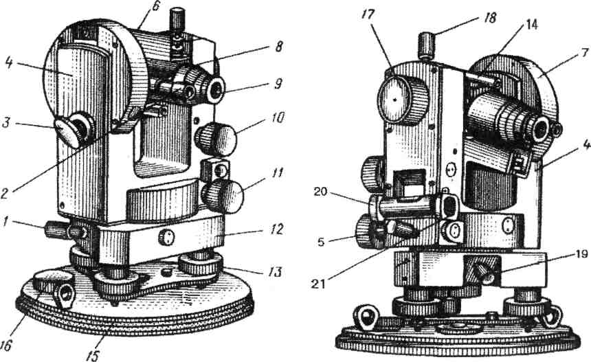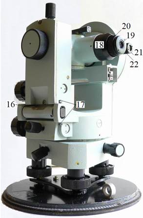5 б. Теодолит 3Т15П. 1 – трегер, 2 – подъемные винты подставки, 3 – подставка, 4 – закрепительный винт лимба, 5 – наводящий винт алидады, 6 – закрепительный винт алидады, 7 – винт вращения лимба, совмещения нулей лимба и алидады, 8 – цилиндрический уровень, 9 – юстировочные винты цилиндрического уровня, 10 – микрометренный винт шкалового микроскопа, 11 –наводящий винт зрительной трубы, 12 – стойки, 13 – зеркало подсветки оптической системы, 14 – оптический визир, 15 – вертикальный круг, 16 – винт фокусировки, 17 – ось зрительной трубы, 18 – зрительная труба (объектив), 19 – зажимной винт зрительной трубы, 20 – цилиндрический уровень при зрительной трубе