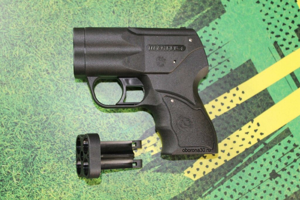 Это что-то среднее между газовым пистолетом и газовым баллончиком. Патронами являются малогабаритные аэрозольные баллончики — БАМы. Боёк бьёт по капсюлю и пороховые газы выталкивают состав в цель на расстояние до 3,5 м. Выпускаются модели с зарядом 2,4 и 5 БАМов. Следует отметить, что на некоторых зарядах имеется твёрдая заглушка, которая может травмировать нападающего, уточните это при покупке.