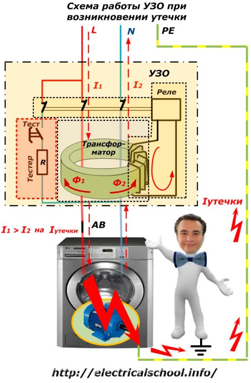 Давайте рассмотрим на практике, как УЗО может спасти нас от поражения электрическим током. Допустим в электрической части стиральной машины повредилась изоляция и корпус оказался под напряжением. Если в электропроводке квартиры предусмотрено заземление, то между корпусом и «землей» возникнет ток утечки, сработает УЗО и отключит электричество. Но что произойдет, если заземления в доме нет? Допустим кто то из людей заходит в ванную комнату и случайно дотрагивается до стиральной машины. В момент прикосновения возникает ток утечки, УЗО срабатывает и отключает электричество. Срабатывание устройства защитного отключения происходит мгновенно (не более 30 мс) и человек практически не почувствует воздействие электрического тока (при правильно подобранном УЗО с минимальным током утечки).