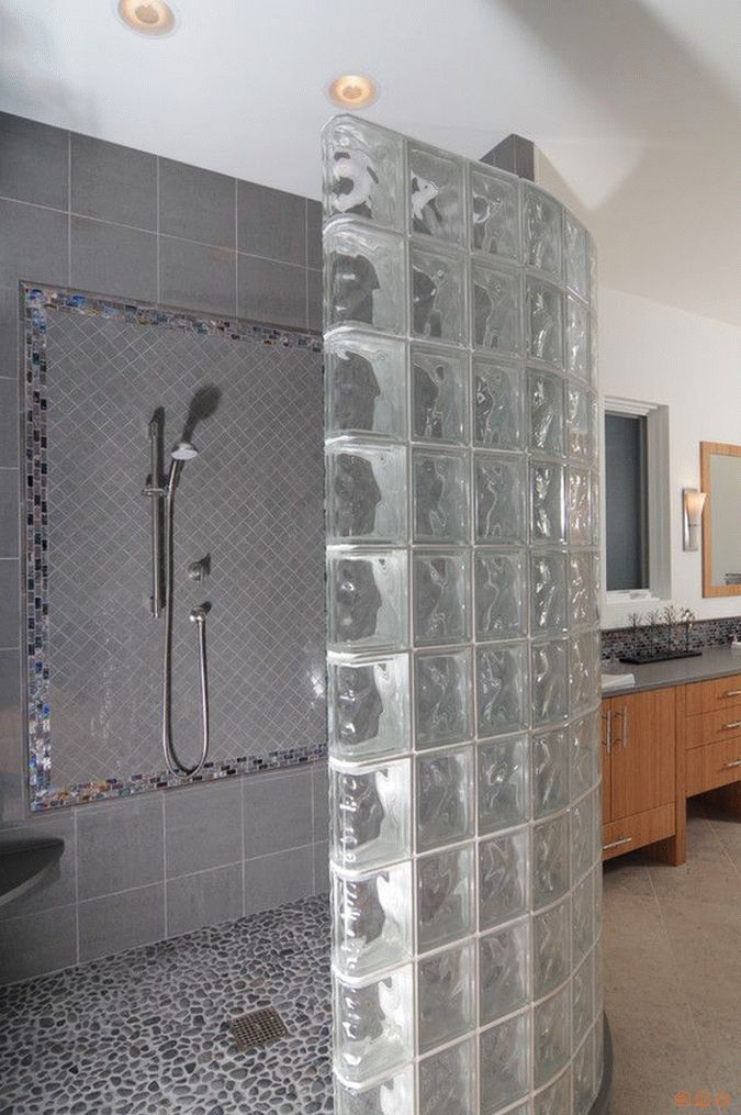 Очень часто стеклоблоками отделяют зону душевой кабины. Такое ограждение надёжнее хрупких перегородок из цельного стекла и эстетичнее обычных шторок. Из стеклоблоков можно сделать все стены душевой. Такие конструкции выглядят впечатляюще, особенно при взаимном отражении стенок душевой кабинки и преломлении попадающих капель воды. Закруглённые ограждения в исполнении из стеклоблоков получаются особенно оригинальными и в душевой зоне выглядят наиболее органично.