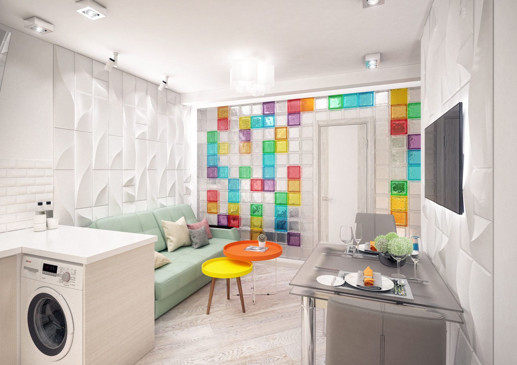 Если акцентной деталью интерьера выступает пёстрая настенная плитка или кафель на полу, цветные стеклоблоки следует использовать очень осторожно, чтобы они не конкурировали с основной отделкой и не раздражали зрение. Если есть сомнения, лучше сочетать цветной стеклокирпич с прозрачным или отказаться от цветных вставок совсем.