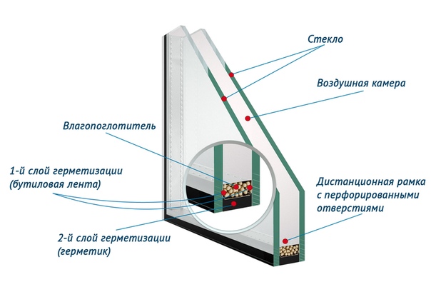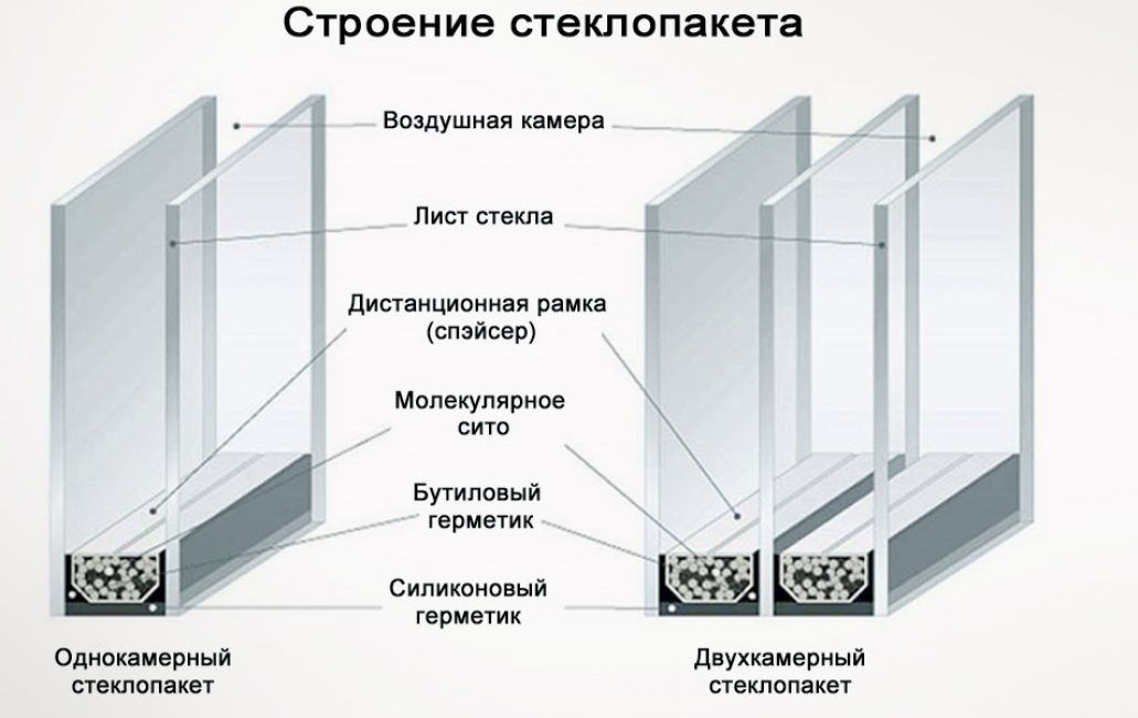 - стеклопакет. Бывает однокамерный (два стекла) и двухкамерный (три стекла). Стеклопакет представляет собой герметичную конструкцию из нескольких стекол, которая герметично закреплена в профиле ПВХ. Для поглощения влаги во избежание запотевания между стеклами расположена тонкостенная рамка из алюминия, покрытая молекулярным ситом. Для улучшения теплоизоляции может быть использован инертный газ аргон. Стекла в стеклопакете бывают разной толщины с разным расстоянием между собой.