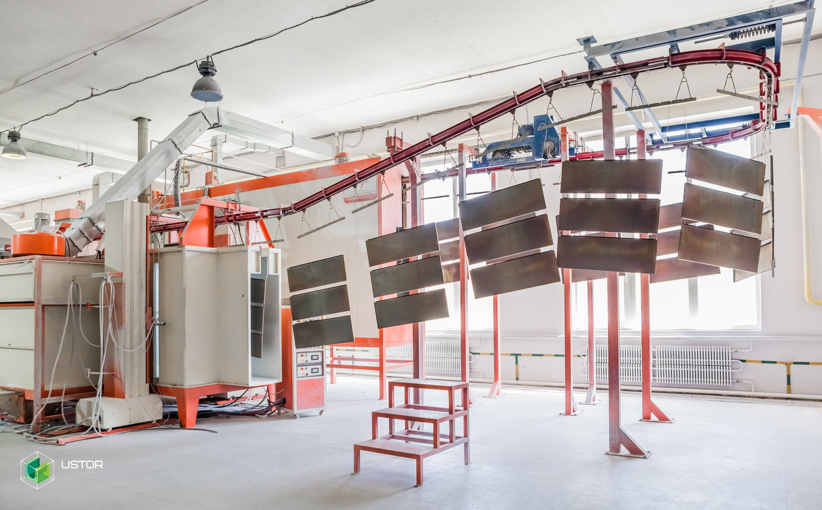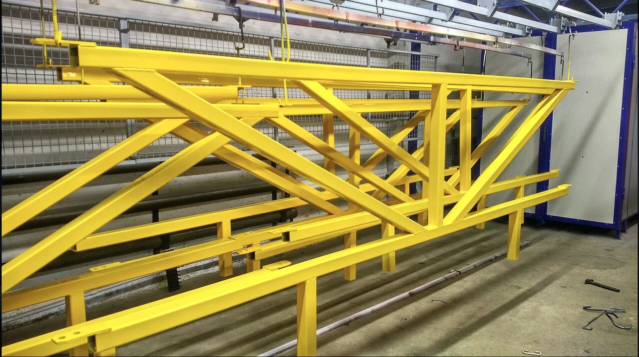 Благодаря этому химическому процессу, порошковая покраска металлоконструкций отличается повышенной долговечностью. Процесс полимеризации покрытия проходит в течение 60-30 минут. - Транспортные устройства. Покрываемые изделия из металла в основном громоздкие и относительно тяжелые. При этом транспортировка их должна осуществляться аккуратно, чтобы нанесенная порошковая краска не осыпалась во время их перемещения. Вследствие этого для транспортировки металлоконструкций применяются специальные тележки, которые двигаются по подвесному монорельсу. На этих транспортных устройствах изделия остывают после извлечения из камеры полимеризации.