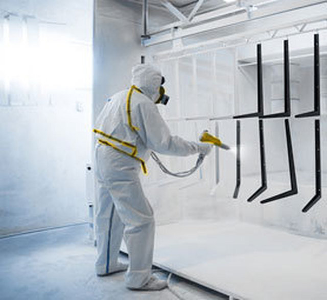 Изделия, с предварительно обезжиренной поверхностью, помещают в покрасочную камеру. В ней полимерный порошок, используя пневматический пульверизатор, наносится на металлическую конструкцию либо изделие. За счет электростатического напряжения частички краски прилипают к окрашиваемой поверхности изделия. Не прилипший порошок остается на стенках камеры. Его периодически собирают в специальный приемник, расположенный под ее днищем, и повторно используют для покраски.
