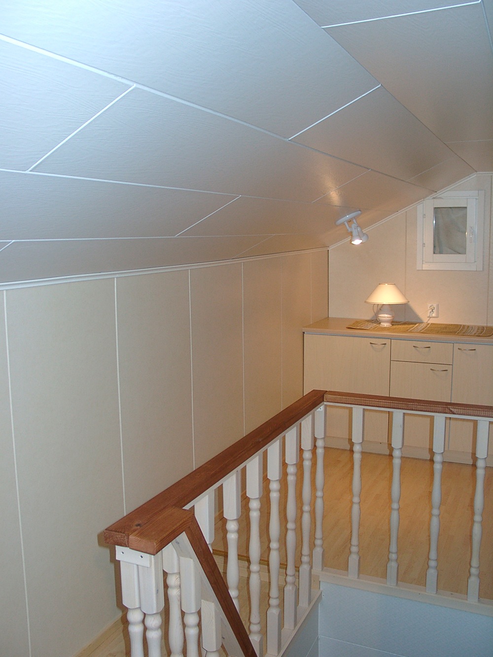 Внутренние и внешние потолочные панели из ПВХ придают помещению, в котором они используются, пластик .Кроме того, между каждой панелью видны линии стыка.