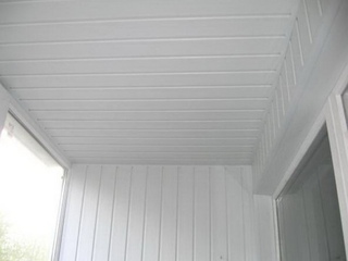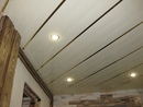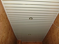 Здесь, для отделки потолка использованы бесшовные ПВХ панели. Они действительно создают практически сплошную плоскость и стыки между планками практически незаметны. Этому в немалой степени способствует особый рисунок на лицевой стороне детали.