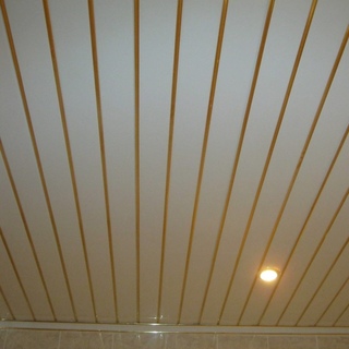 Для отделки потолка в большинстве случаев используют светлый однотонный пластик, например, белый или близкий по цвету. Что касается фактуры, доступны матовые или глянцевые варианты, а также панели с вставками, имитирующими металлический блеск.