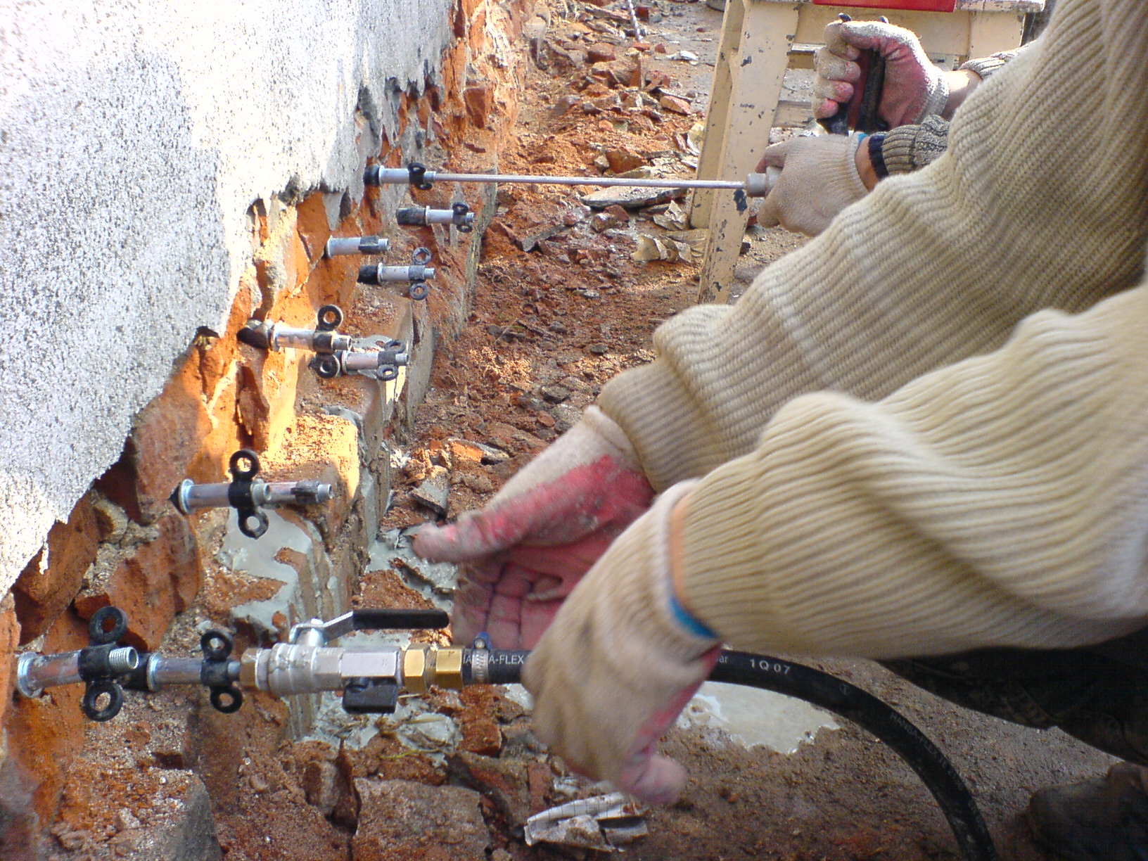 Фундаменты кирпичных и каменных загородных и городских домов ремонтируют путем отрывки траншеи, армирования и бетонирования периметра, либо же посредством изготовления буроинъекционных свай.