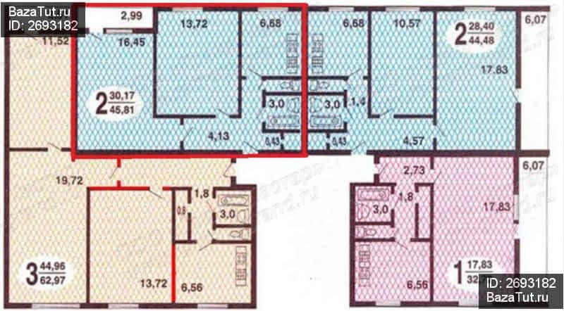 - Трехкомнатная квартира имеет – жилую площадь порядка 45 кв. м. и общую около 64 кв. м.