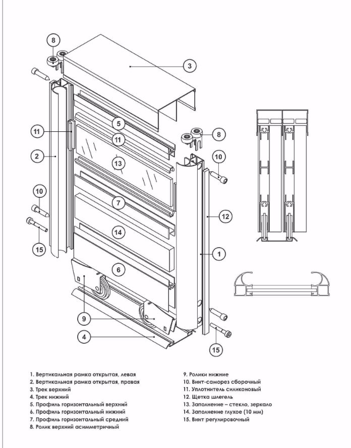 Справка. К набору покупных деталей прилагается инструкция, где приводятся чертежи и схемы сборки распашных створок для шкафа купе.