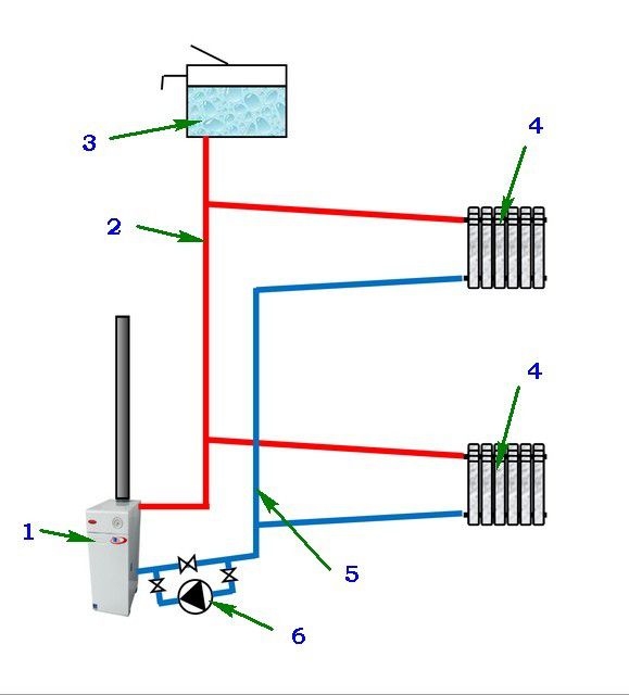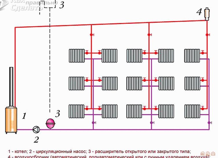 Система отопления представляет собой герметичный замкнутый контур. Поэтому, чтобы избежать внутренних гидроударов, иметь возможность удалять воздух или производить замену теплоносителя, используется расширительный бачок, который может быть установлен в любой части схемы с принудительной циркуляцией.
