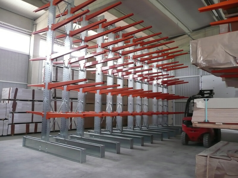 Система реализована на базе консольных передвижных стеллажей. Стойки консольных стеллажей устанавливаются под углом 45° к плоскости передвижного основания, что даёт возможность использовать кран-балку при разгрузке и погрузке длинномерных грузов на каждый уровень хранения.