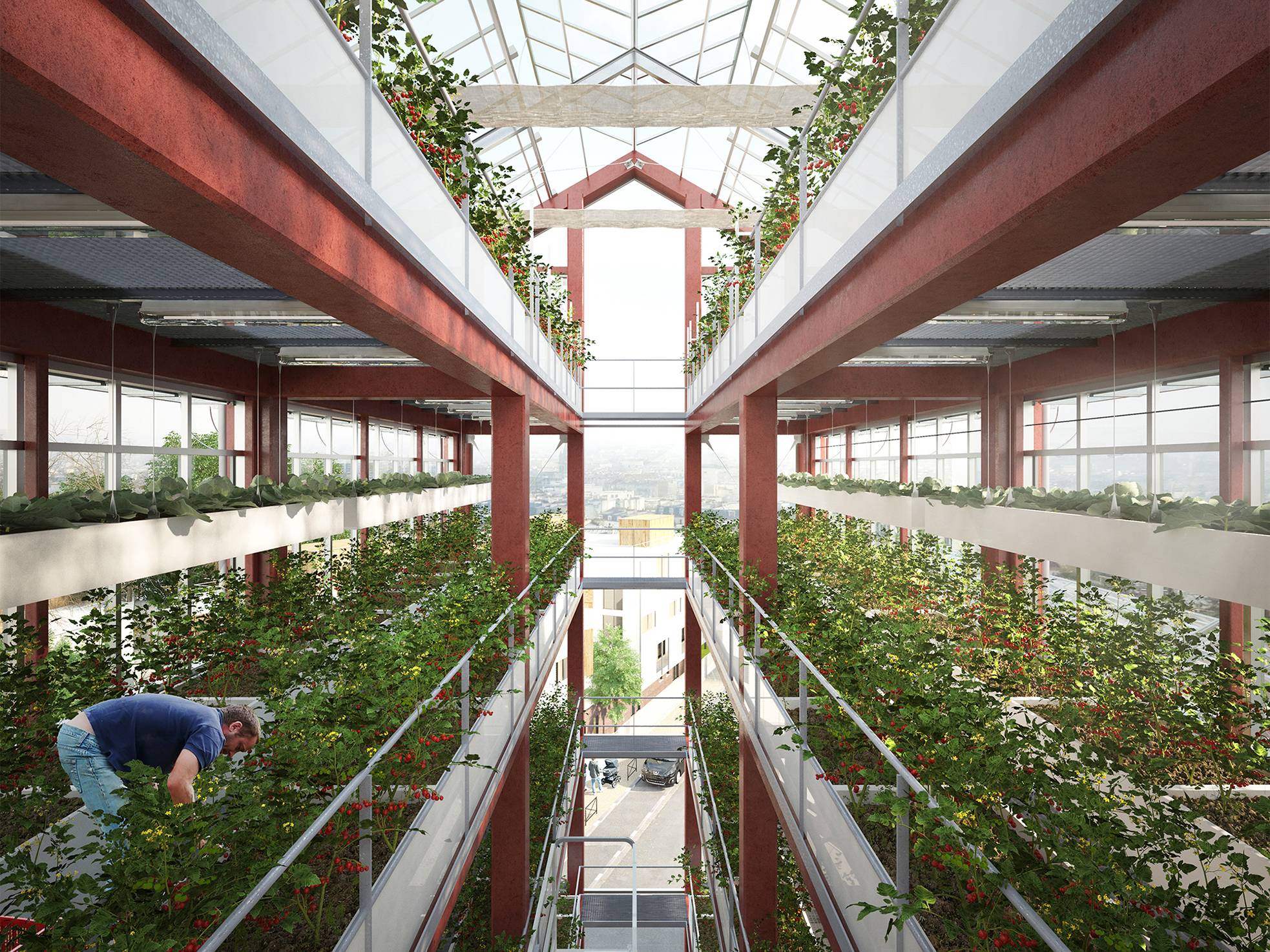 Здание представляет собой очень необычный архитектурный гибрид офисных помещений и теплицы. С южной стороны, там где максимум света и тепла, будут расположены помещения для выращивания овощей, а в теневой части здания разместятся офисы, заняв примерно 2/3 площади. Проект получил название The World Food Building, а возведение здания началось в 2012 году. По подсчетам авторов проекта, эта вертикальная теплица сможет обеспечить около 5 000 жителей города свежими продуктами, производя более 500 тонн полезных овощей.