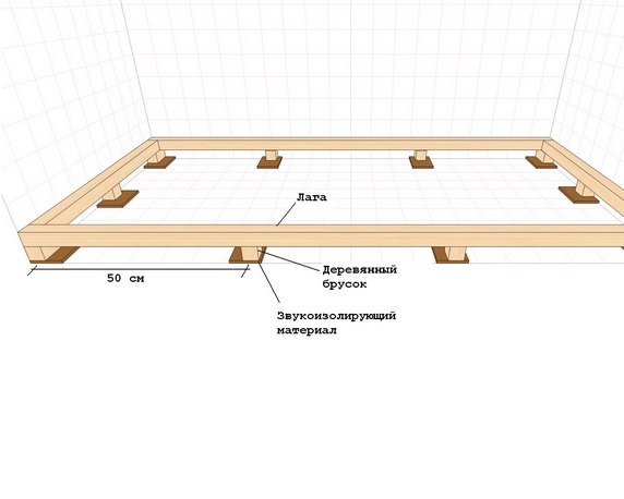 Далее приступают к установке самих лаг. Но для начала под каждую из них рекомендуется подложить звукоизоляционную прокладку из технической пробки или вспененного полиэтилена толщиной 1-3 см.