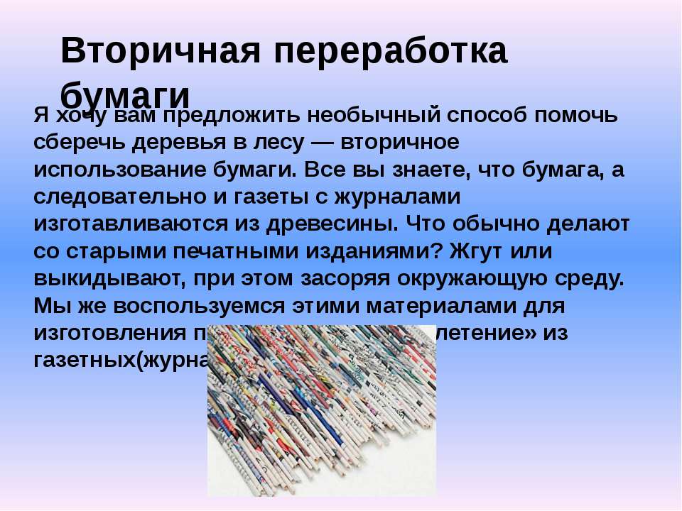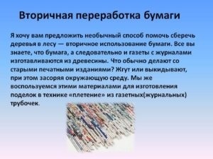 Таким образом изделия из бумаги обретают вторую жизнь и приносят огромную пользу природе и человеку. Необходимость в них постоянно увеличивается в процессе хозяйственной деятельности, поэтому объемы переработки растут, а технологии совершенствуются и никогда не останутся невостребованными.