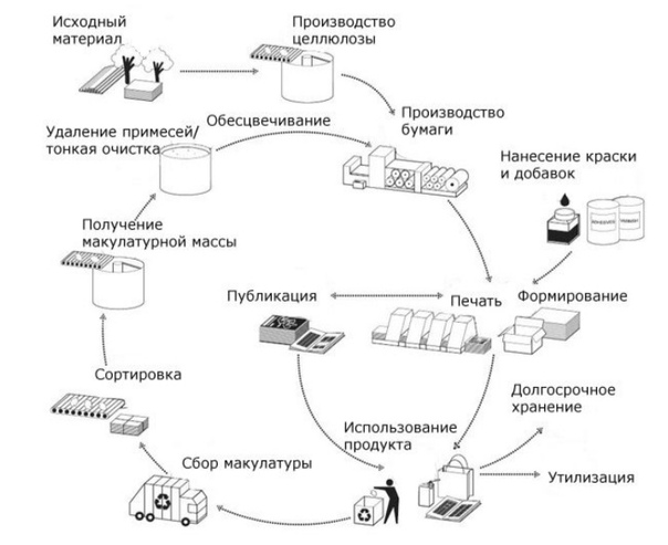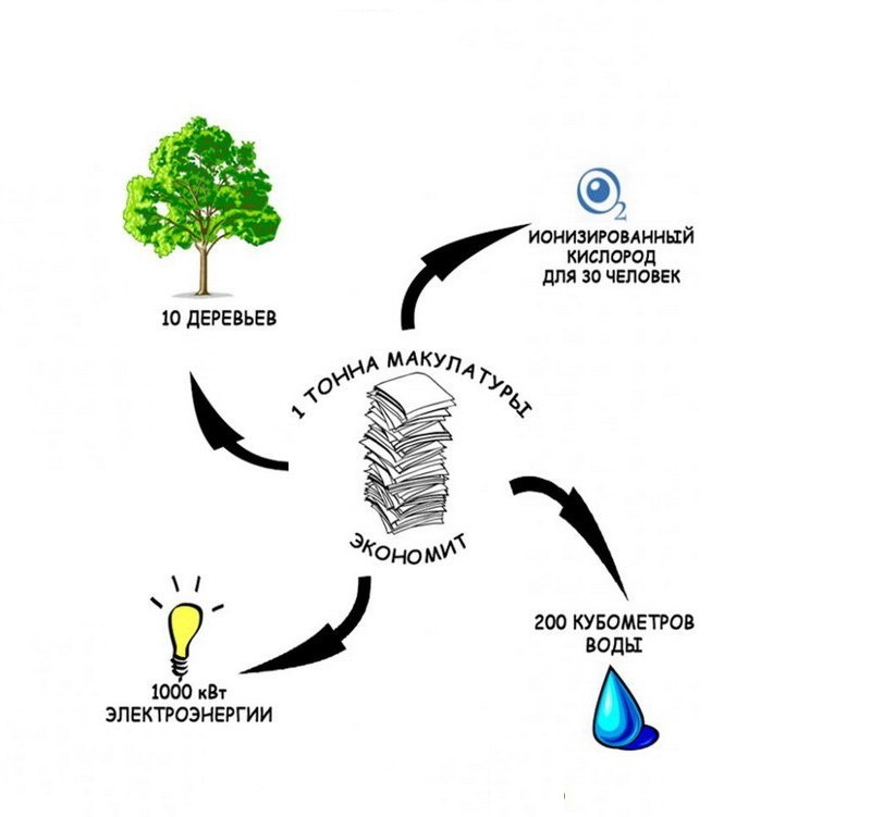 Согласно недавним исследованиям, проведенным в США, обычные офисные работники потребляют приблизительно 500 граммов бумаги на каждого, из которых 77 % истраченной бумаги может подвергаться вторичной переработке. В основном это высококачественная бумага. Чтобы изготовить новую бумагу из «старой», необходимо на 30–50 % меньше энергии, чем при производстве новой, вырубая деревья. Бумага составляет 40 % отходов, хранящихся на полигонах. Если снизить их количество, удастся продлить «жизнь» полигонов. Бумага производится из целлюлозной пульпы (массы), к которой добавляют пигменты и наполнители. Исходный материал целлюлозы – древесина. Чтобы изготовить 1 тонну целлюлозной массы, необходимо 3,5 тонны древесины; в свою очередь, одна тонна макулатуры защищает от вырубания в среднем шесть деревьев.