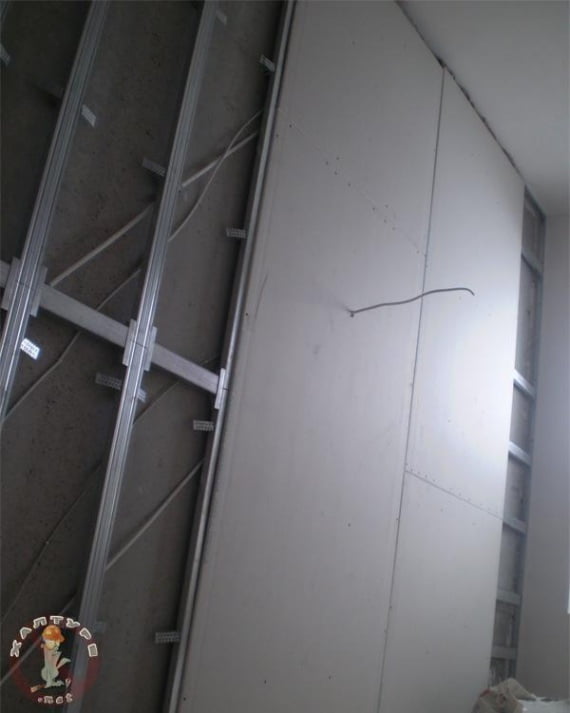 Делается это с шагом в сорок-шестьдесят сантиметров. Очень важно соблюдать выбранное расстояние. Так, удается быстро находить стойки, даже когда они уже зашиты листами гипсокартона.