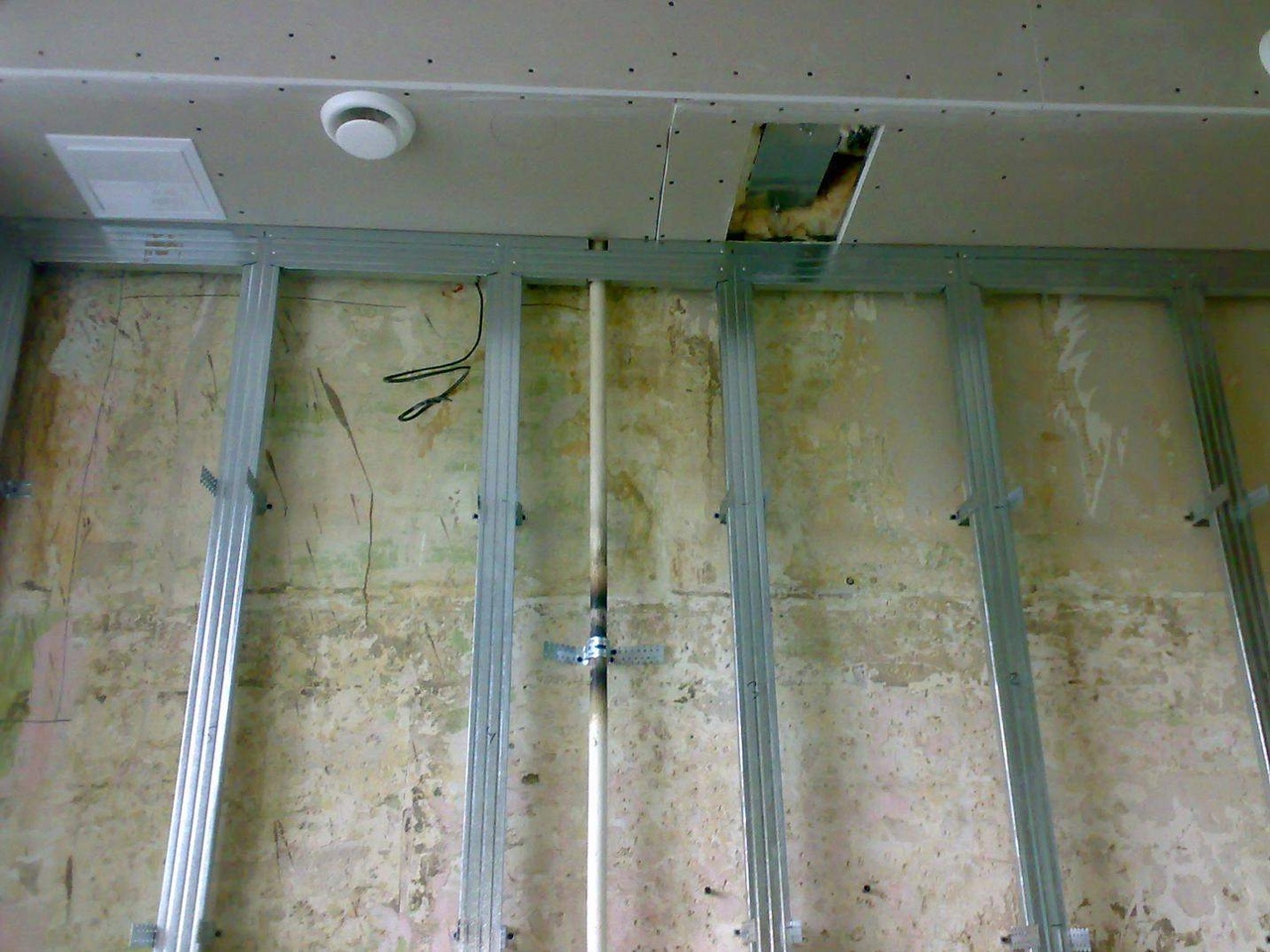 При желании можно обить старую рыхлую штукатурку, чтобы в будущем не слушать как она медленно крошится за каркасом с гипсокартоном.