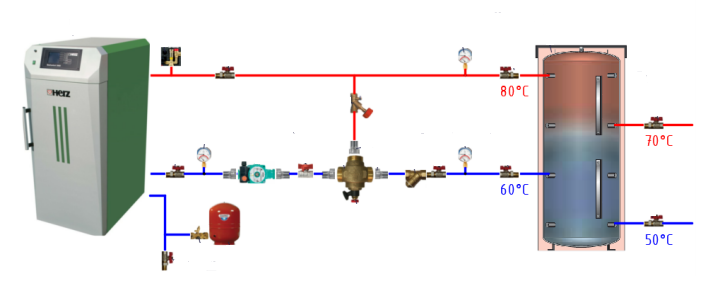 Но после остановки клапан откроется и теплоноситель продолжит циркуляцию естественным образом. Даже если в это время произойдет какая-то авария с твердотопливным котлом и нагрев воды не остановится, то тепло будет отводиться в буферную емкость, пока дрова в топке не прогорят.