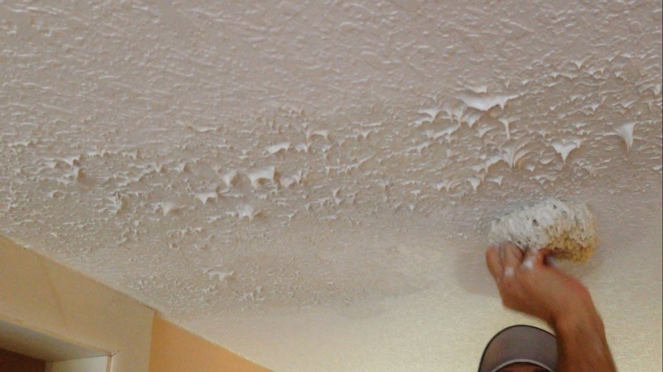 Когда потолок готов, нужно смоченным в воде мастерком слегка пригладить нанесённый на потолок материал.
