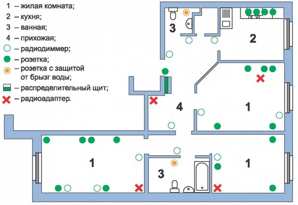 Кроме схемы электроснабжения, электропроводка монтируется самостоятельно, когда есть электрическая схема, которая накладывается на план квартиры и включает следующие элементы: